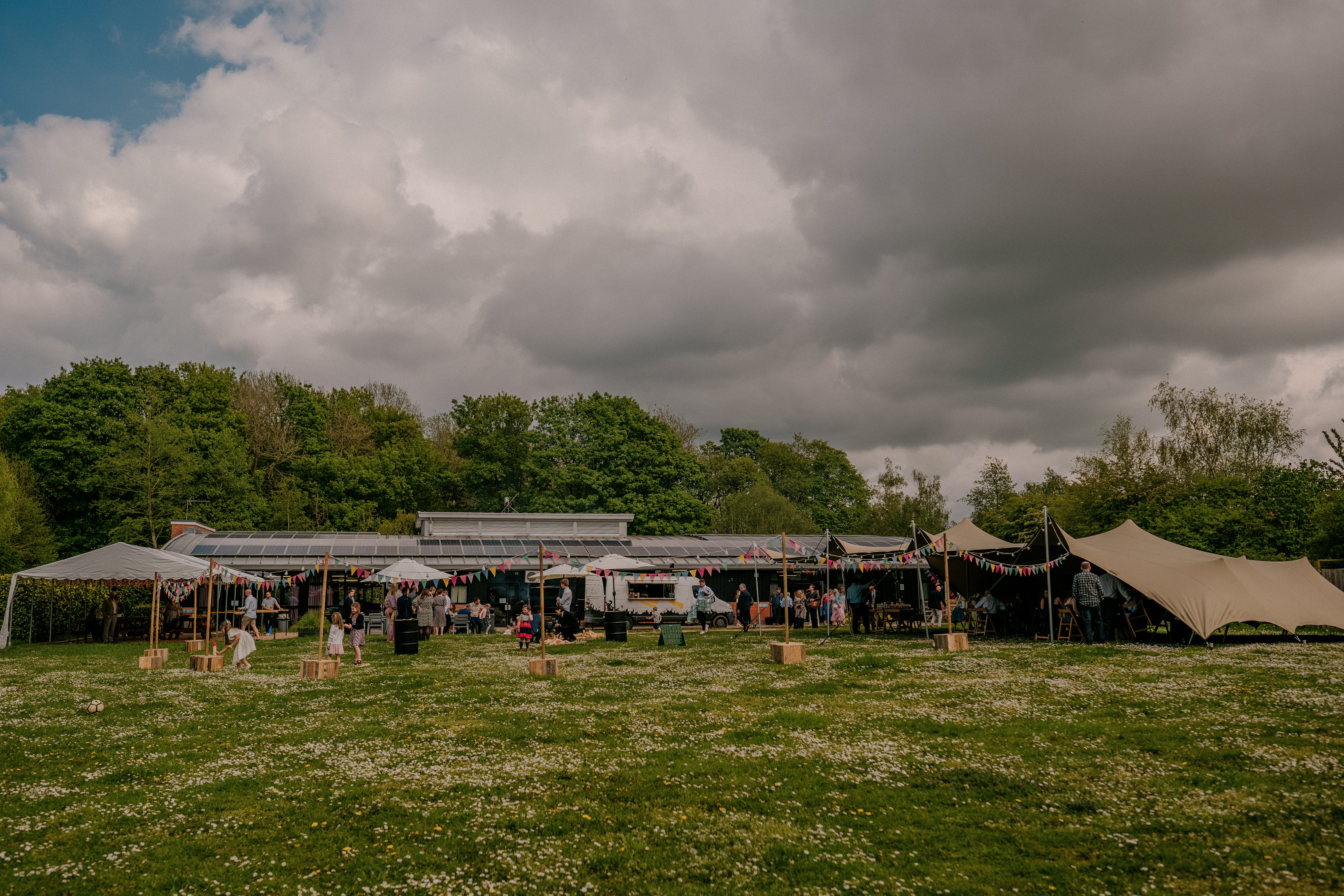On the grounds of the venue there was one of our 15m x 10,5m stretch tents. As well as some of our Oil Drum Tables with Parasols and handmade wooden Trestle Tables. To create the perfect vibe for the party we used our free-standing Festoon Poles to create a border for the party. These were used with our festoon lights and colourful flag bunting.